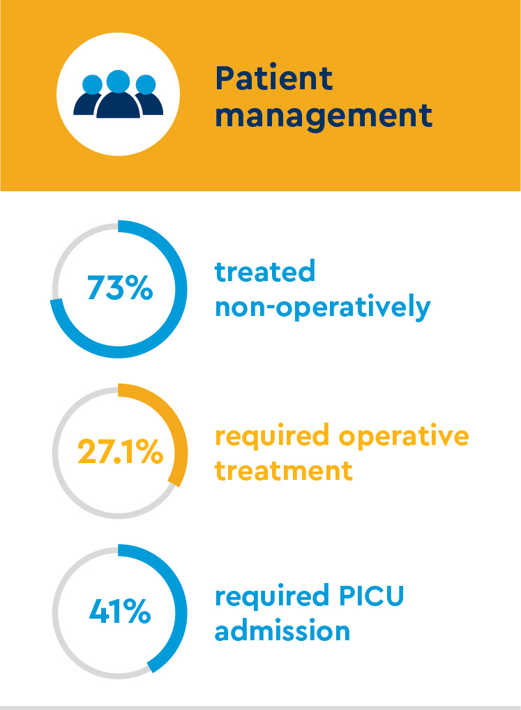 The study authors tested the association between injury acuity and injury characteristics, defining severity by need for surgery or pediatric intensive care unit (PICU) admission.
