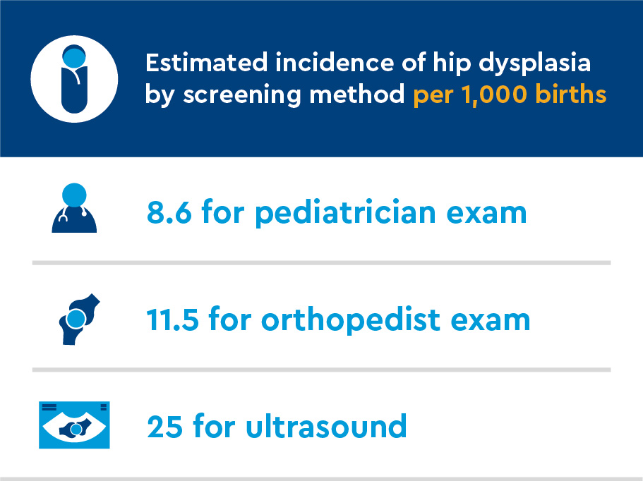 Developmental dysplasia of the hip is a spectrum of hip disorders ranging from complete dislocation of the hip to the abnormal development of the hip socket or acetabulum. While physical examination can diagnose hips that are unstable, there are no exam findings that can diagnose an abnormal acetabulum. A screening ultrasound is recommended for infants with risk factors for developmental dysplasia of the hip, such as family history and breech presentation, or if there is a hip click on an exam.