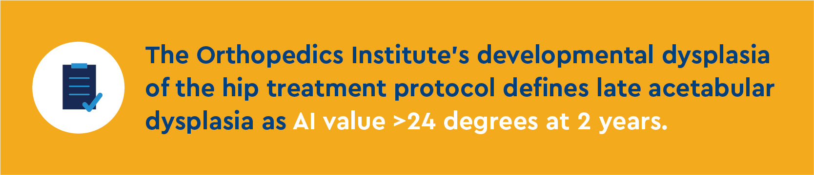 Early diagnosis and accurate treatment of infants with hip dysplasia leads to the best outcomes. Children with recurrent dysplasia at 2 years old are at increased risk for osteoarthritis and functional limitations in adulthood. There’s a 3-33% incidence of acetabular dysplasia at 2 years old after successful treatment.
