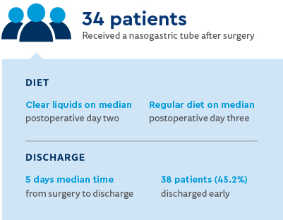 While none of these factors were associated with discharge timing, early refeeding was associated with early discharge. Thus, these factors should be considered when developing a postoperative care pathway.