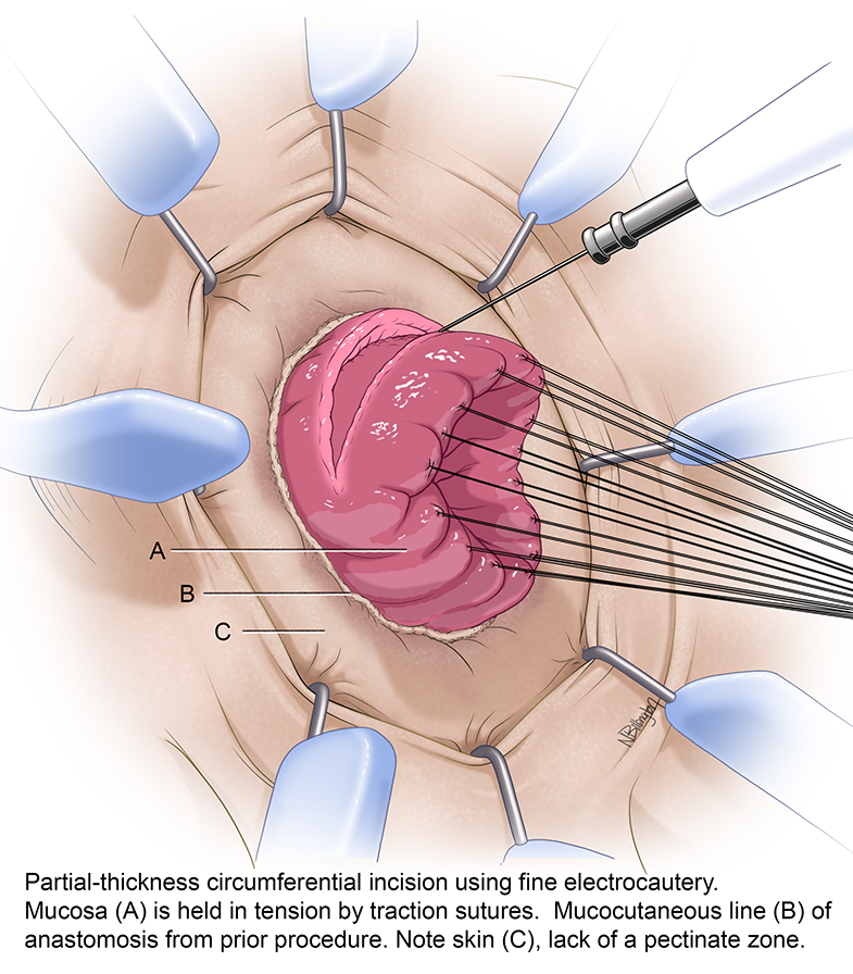 Partial thickness circumferential incision using fine electrocautery (A) Traction sutures are placed in the mucosa. (B) The mucocutaneous line from the previous anoplasty. (C) Skin: Note the lack of a pectinate line in the distal rectum.