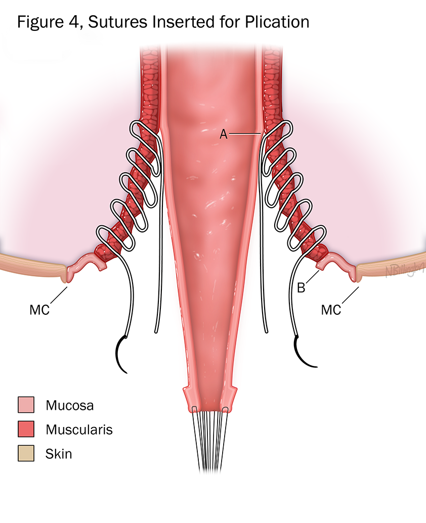 The technique dissects about 5 to 8 cm of rectal mucosa, exposing the muscle of the rectum. The team adds stiches on the rectum in a longitudinal way to create a plication or folds in the muscular wall, in all its circumference, forcing the proximal and distal mucosa closer to each other. They remove the dissected mucosa, shortening the muscle, and they connect the proximal and distal mucosa together with long-term absorbable sutures. It creates a unique and positive aesthetic effect and the anus appears closed.