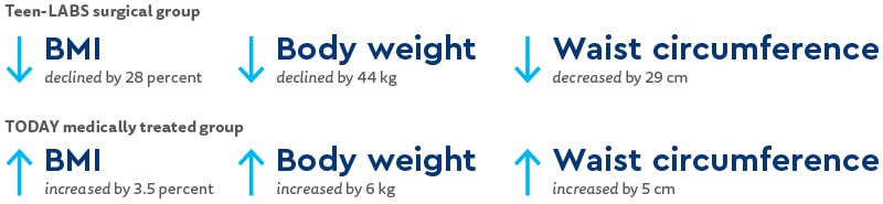 Data from participants in the Treatment Options for Type 2 Diabetes in Adolescents in Youth (TODAY) and Teen-Longitudinal Assessment of Bariatric Surgery (Teen-LABS) studies were used to compare surgery with medical management of severely obese adolescents with type 2 diabetes.