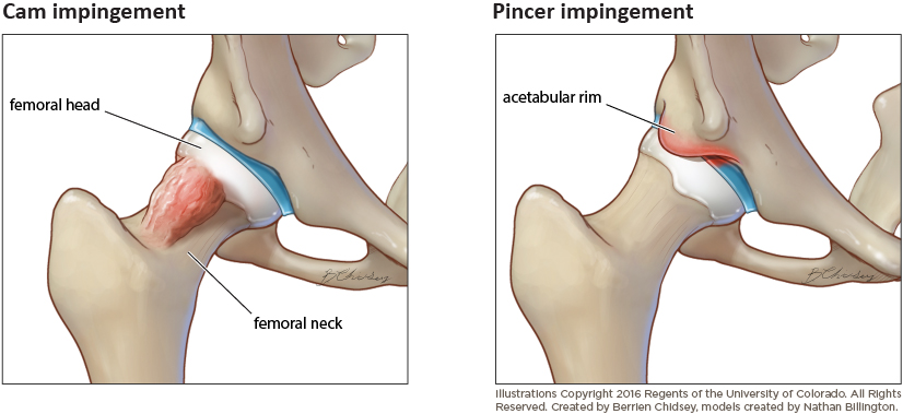 FAI may occur from deformities of the femur, which is called cam impingement, or from deformities of the socket which is called pincer impingement. It can also occur in children who suffer from deformities of both the thigh bone and the hip socket simultaneously.