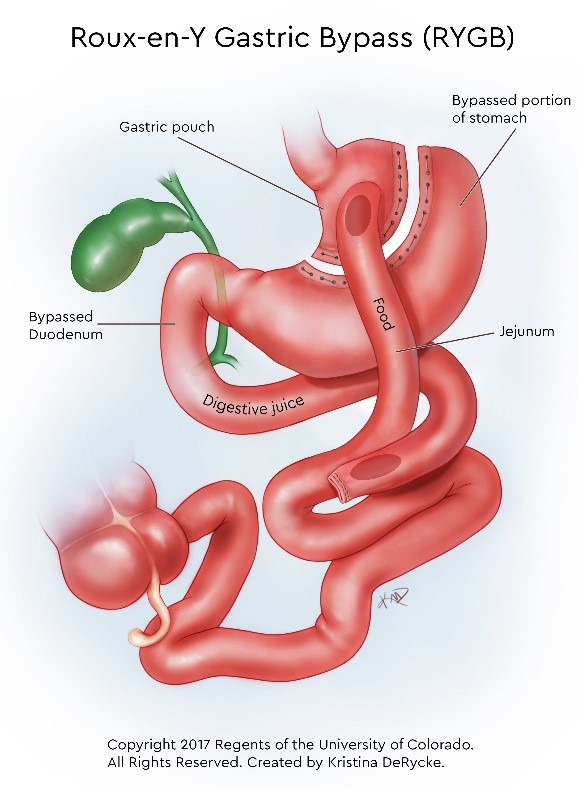 The Roux-en-Y gastric bypass (RYGB) is a type of weight loss surgery that involves two steps. First, a small stomach pouch is created. Next, a part of the small intestine is separated and reconnected to the small stomach pouch, bypassing a portion of the small intestine. This decreases the amount that your teen can eat or drink at each meal. This procedure takes about two to four hours.