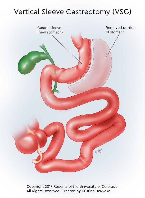 Vertical sleeve gastrectomy (VSG) is an irreversible procedure to reduce the size of the stomach by removing a portion of it. This causes weight loss by limiting the amount of food that can be eaten at one time. This procedure takes about two hours.