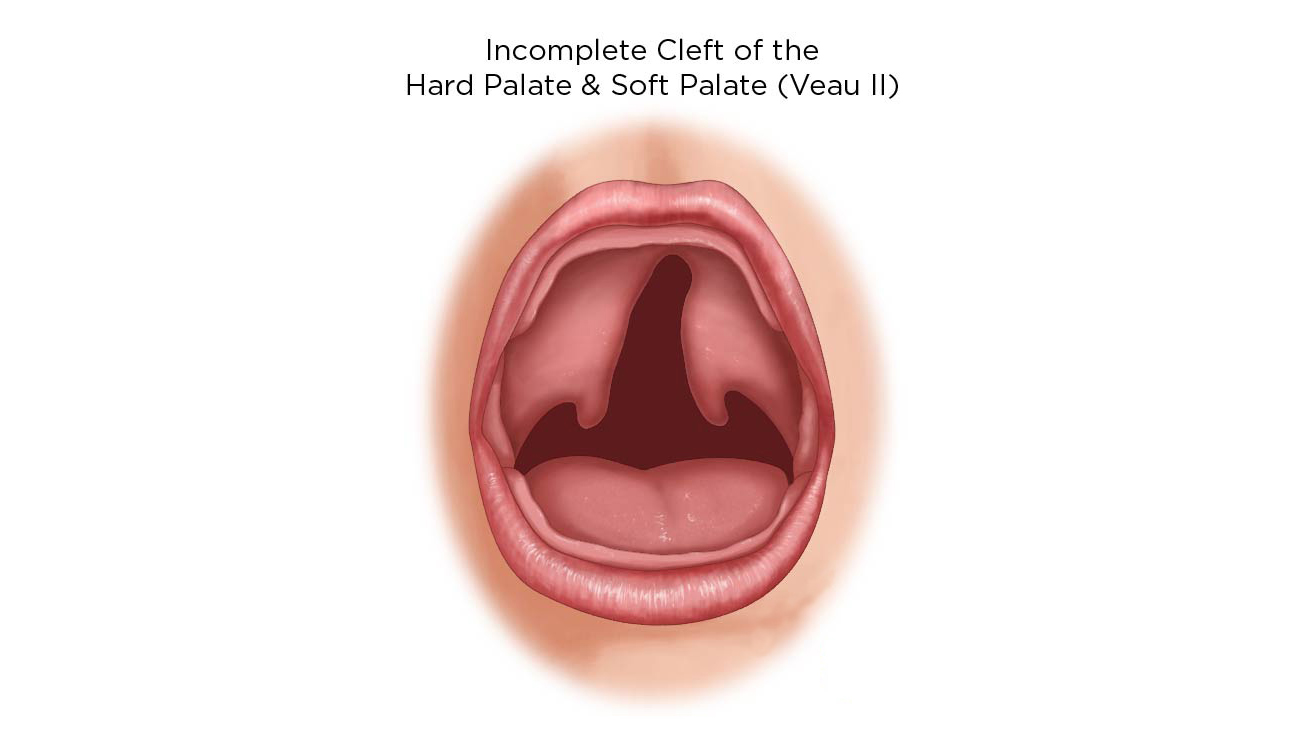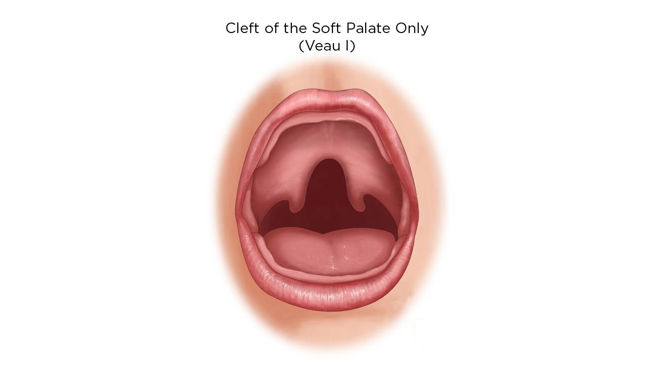 Cleft of the soft palate: a split or opening on the roof of the mouth affecting only the soft tissue section