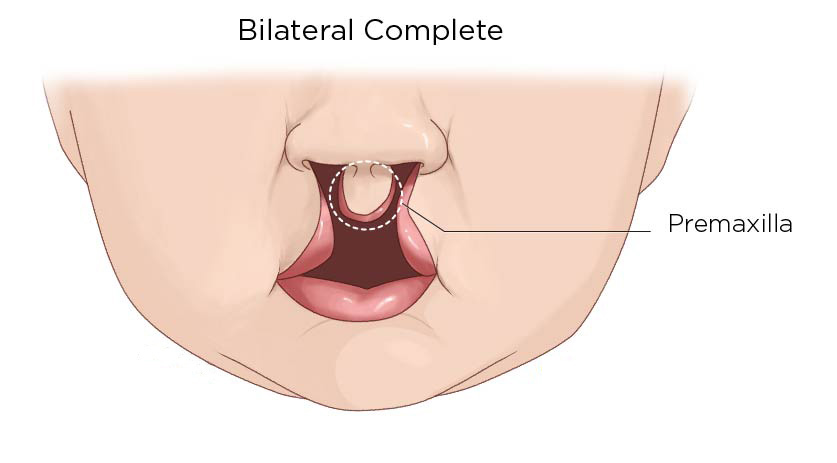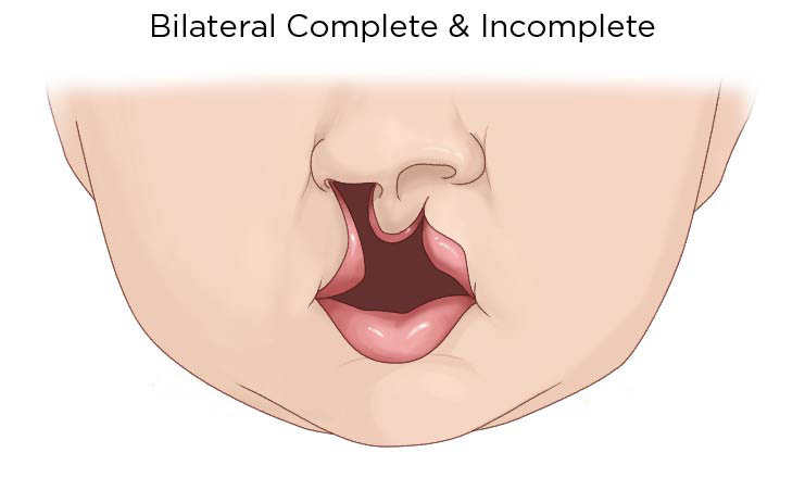 Bilateral cleft:a cleft (split or opening) that occurs on both sides of the philtrum; can be completely open or partially slit
