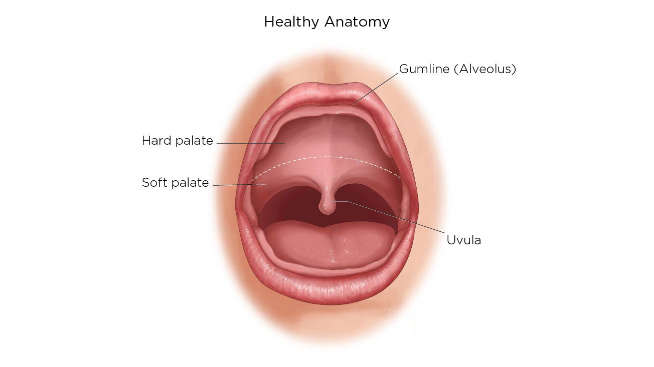Palate: roof of the mouth (made up of a hard section and a soft tissue section)