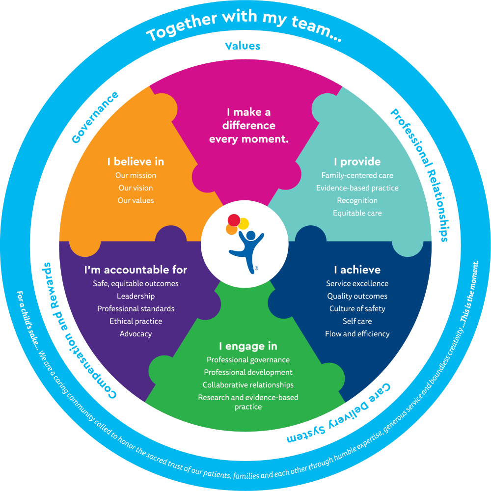 Our Professional Practice Model depicts how nurses practice as professionals at Children’s Colorado. This model represents our: