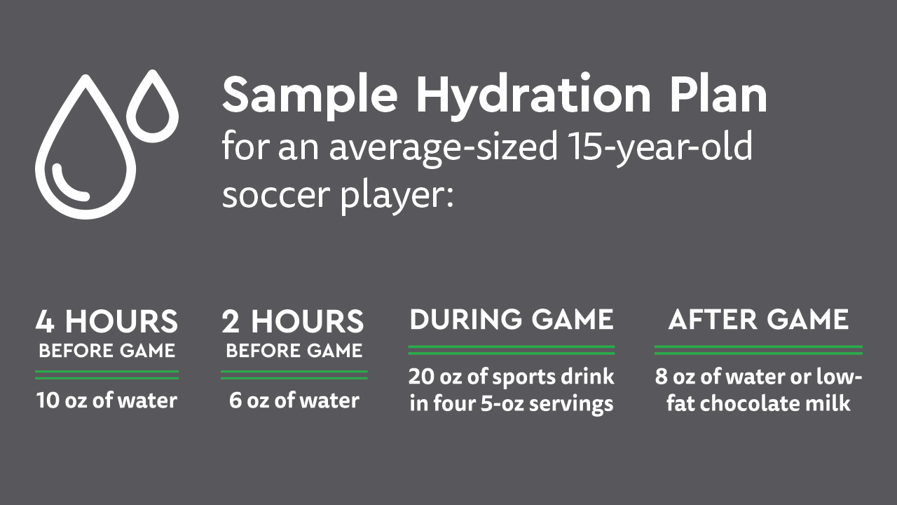 See the sample hydration schedule below for an average 15-year-old football player (5’7”, 130 pounds), who should consume at least 76 ounces of water a day: